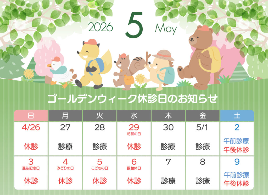 (お知らせテストページ)ゴールデンウィーク休診日のお知らせ HOME (お知らせテストページ)ゴールデンウィーク休診日のお知らせ ゴールデンウィークは暦通り診療を行います。 休診日…4/29(水)、5/3(日)~5/6(水) 診療日をご確認の上、お間違いの無いようお越しください。